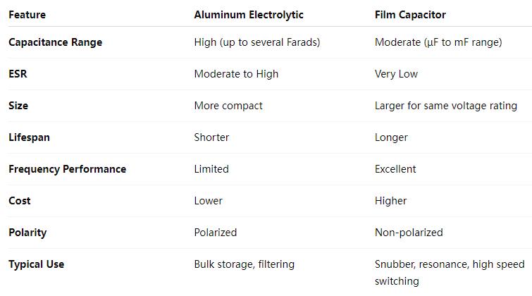 Mỗi loại đều có điểm mạnh và hạn chế. Tụ điện đầu vít điện phân bằng nhôm phù hợp hơn cho các ứng dụng yêu cầu điện dung cao với chi phí vừa phải, trong khi tụ điện đầu vít dạng màng vượt trội trong môi trường có ESR thấp, tuổi thọ cao và hiệu suất tần số cao là rất quan trọng.